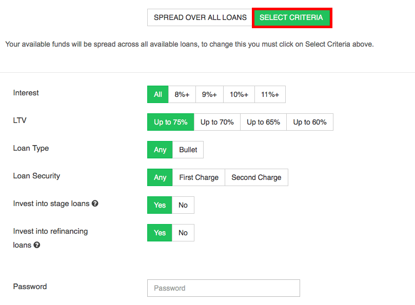 Si deseas poder controlar elementos adicionales de la herramienta de auto inversión, la inversión por proyecto tiene que ser, como mínimo, de 500€. Los elementos adicionales que puedes entonces determinar son los siguientes (tienes que pinchar en “select criteria” en vez de “spread over all loands” para poder ver estos elementos adicionales).